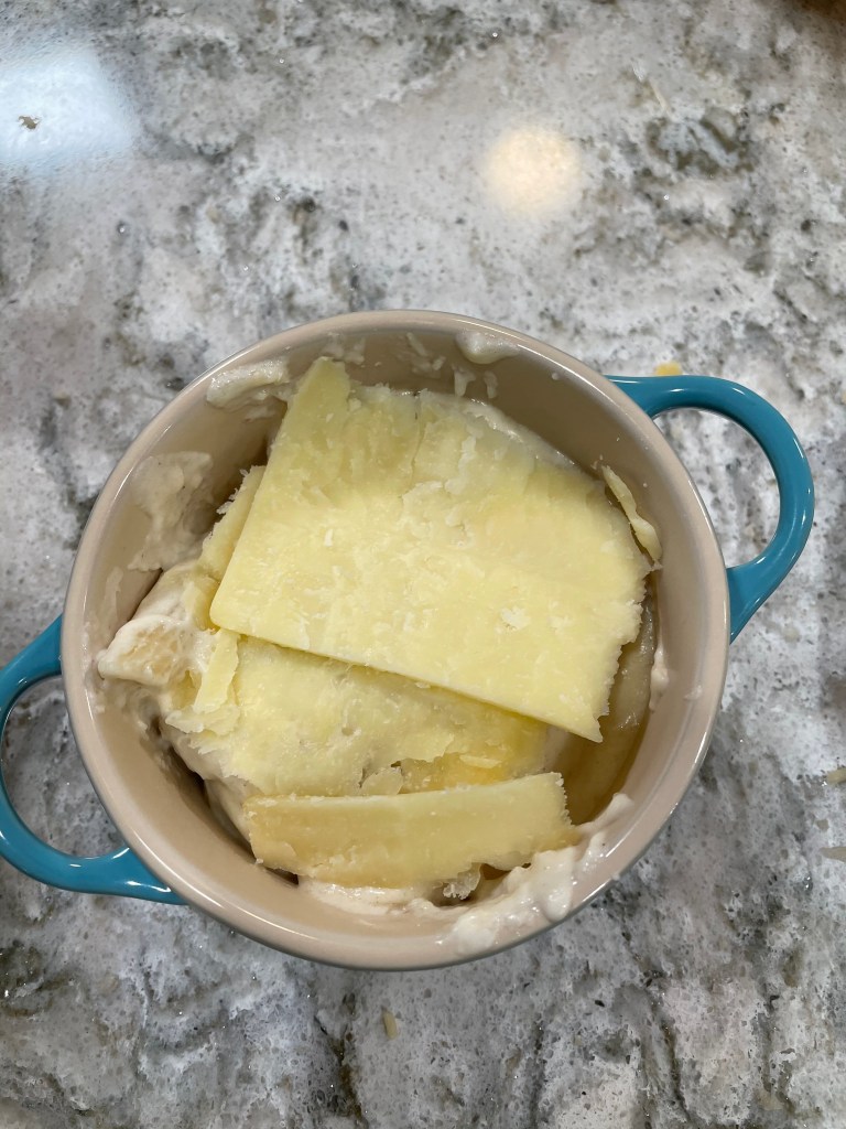 Fill the baking dish half way with mac ‘n cheese. Put a layer of cheese slices down, the more sharp the better. Finish filling the baking dish with mac ‘n cheese. Top it off with grated cheddar, parmesan, and panko bread crumbs.