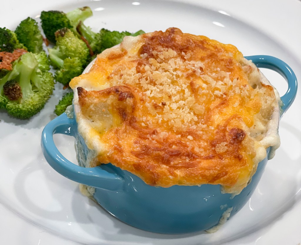 You can use lots of different types of containers to bake the mac n cheese. You can use individual ramekins, casserole dishes, and even tin foil pans to freeze and bake later. This also makes a large amount, so it’s easy to split it into two meals or even double the recipe and make some freezer meals.