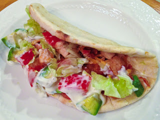 Then, I use pita like a soft taco shell and load up with my favorite toppings–the meat, lettuce, tomato, avocado, and ranch dressing. Enjoy!