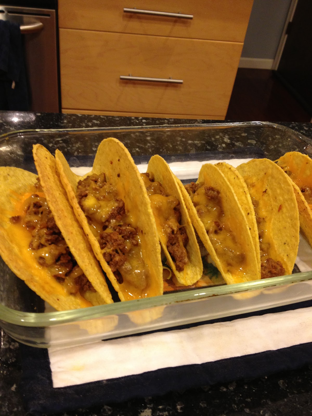 Tuesday nights are taco nights around here. We try to mix it up by having a different kind every week. This week we had hard tacos with ground beef. Not much of a recipe to share with this one, but I saw an idea on pintrest, and thought I’d try it. I broiled my shells in the oven after a put in just the meat and cheese. Then I added the fresh ingredients. Two thumbs up from the taco lovers in our family. Here’s a picture: