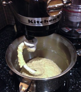 Mix 1 cup of flour along with all the other ingredients in the mixer using the paddle attachment. Change to the dough attachment on the mixer and add flour until the dough looses most of it’s stickiness, but is still soft and pliable. This is enough dough for 1 large pizza.
