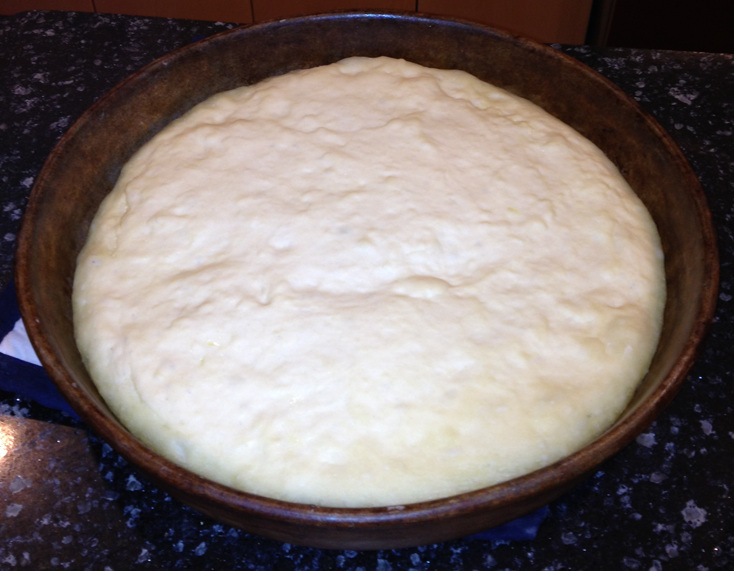 Coat the bottom of a deep dish baker stone with olive oil and then place your crust in the pan. You made need to let it relax for a minute before it will stay in place, depending on what pizza crust recipe you use. I used a frozen ball from the more complex recipe that I sat in the fridge the night before and then let raise all day.