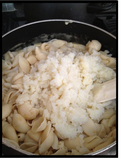 Stir in salt, nutmeg, pepper, and cayenne pepper. Slowly add the cheeses until melted. Drain pasta and add to cheese sauce. Drain the cauliflower and blend in the blender or food processor to a slightly chunky texture.