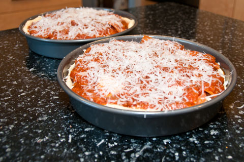 3. Sprinkle 2 cups of mozzarella over the dough for each pizza.  Place your toppings on top of the cheese (if using sausage, you can leave it raw, but make sure to bake for at least 30 minutes). Spread half of the tomato sauce on top of each pizza, then sprinkle 2 tablespoons of parmesan over the sauce. Bake until the crust is golden brown, about 25-35 minutes. Remove the pizza from the oven to rest for 5-10 minutes.