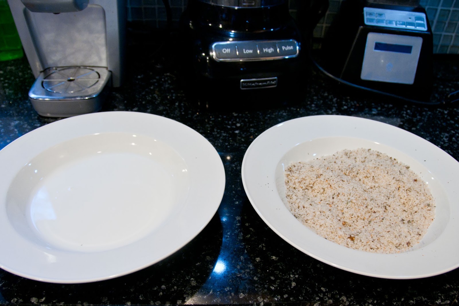 Just use two shallow bowls for the milk and bread crumb mixture.  I go straight from the bread crumbs to the frying pan.