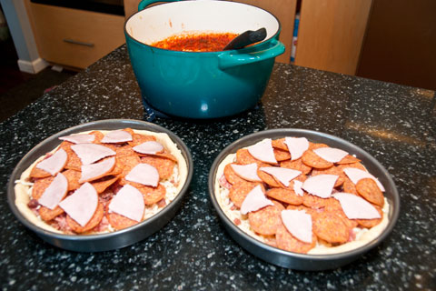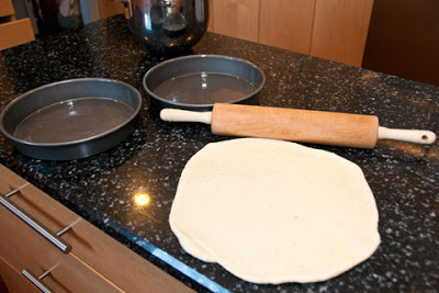 Use a 9″ cake pan, grease with olive oil, and line the pan with the rolled out dough.  Then, first put down the cheese, then the toppings, then the sauce.  Bake.  Serve.  YUM!