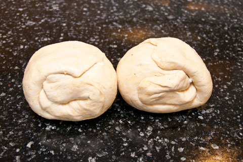 1. Spray your work surface with non-stick cooking spray and turn the dough out onto the work surface.  Roll it into a rectangular shape about 1/4-inch thick.  Spread the softened butter over the dough but leave a ½-inch border along the edges.  Roll the dough into a tight cylinder (like a cinnamon roll).  Cut the roll in half and fold the half into thirds, pinching the seams together to form a ball. Repeat with the other half.  Place both dough balls into an oiled bowl and cover tightly with plastic wrap. Let the dough balls rise in the refrigerator until doubled in size, about 45-60 minutes.