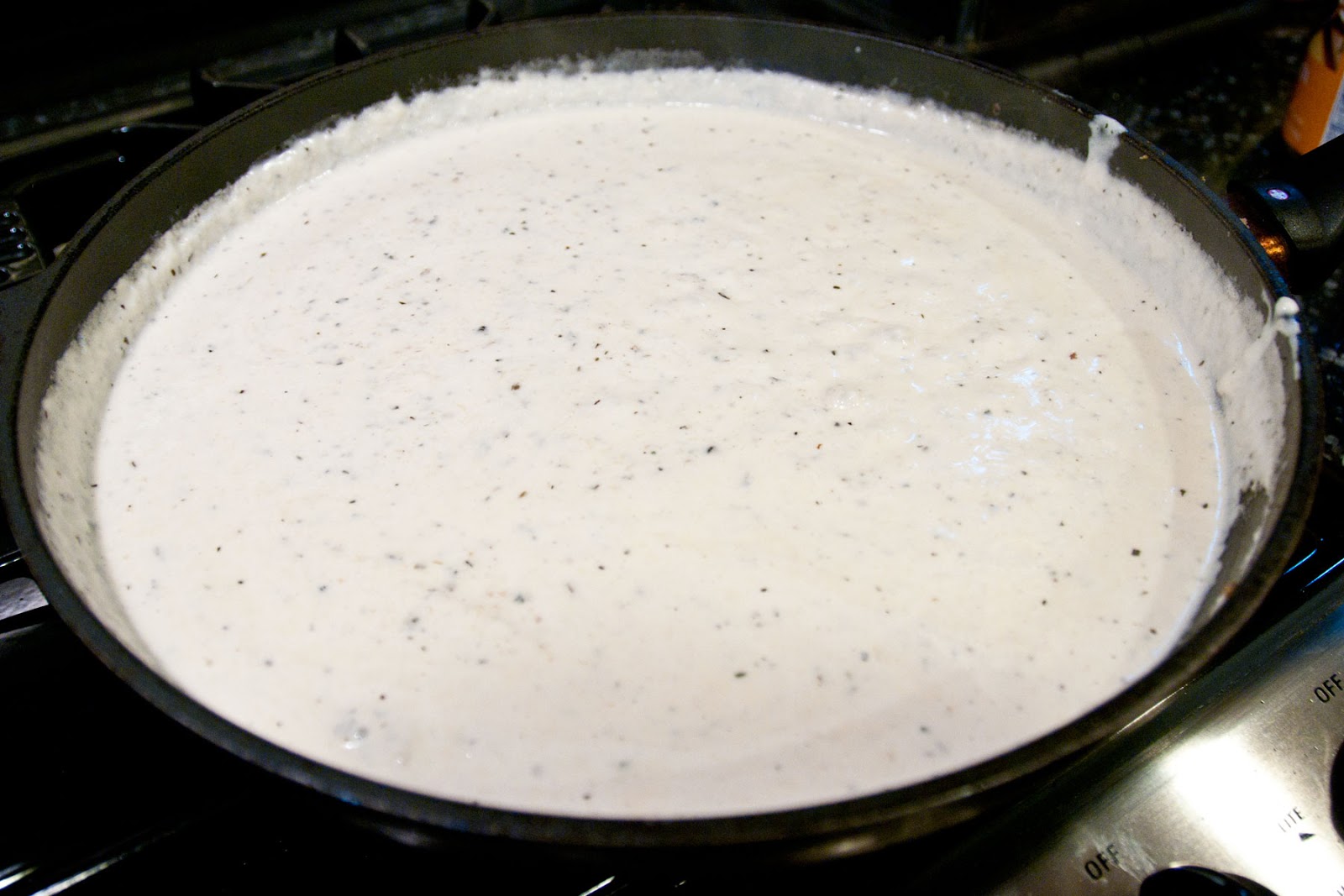 After adding the sauce ingredients, including the Parmesean cheese, I thicken it with a corn starch surrey.