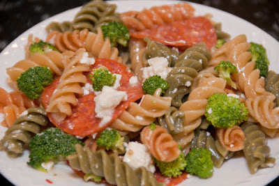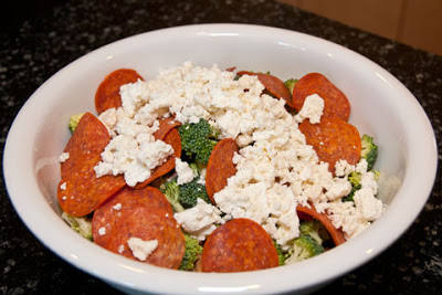 Boil the water and add the salt.  Add the pasta to the boiling water.  Cook for 8-10 minutes.  Drain the pasta in a strainer and rinse with cold water.  Cut the broccoli into small bite sized florets and discard the stems.  Add pasta and broccoli to a salad bowl, along with pepperoni, and crumbled Feta cheese.  Pour the Italian dressing over the top and toss together.  Serves 8-12.