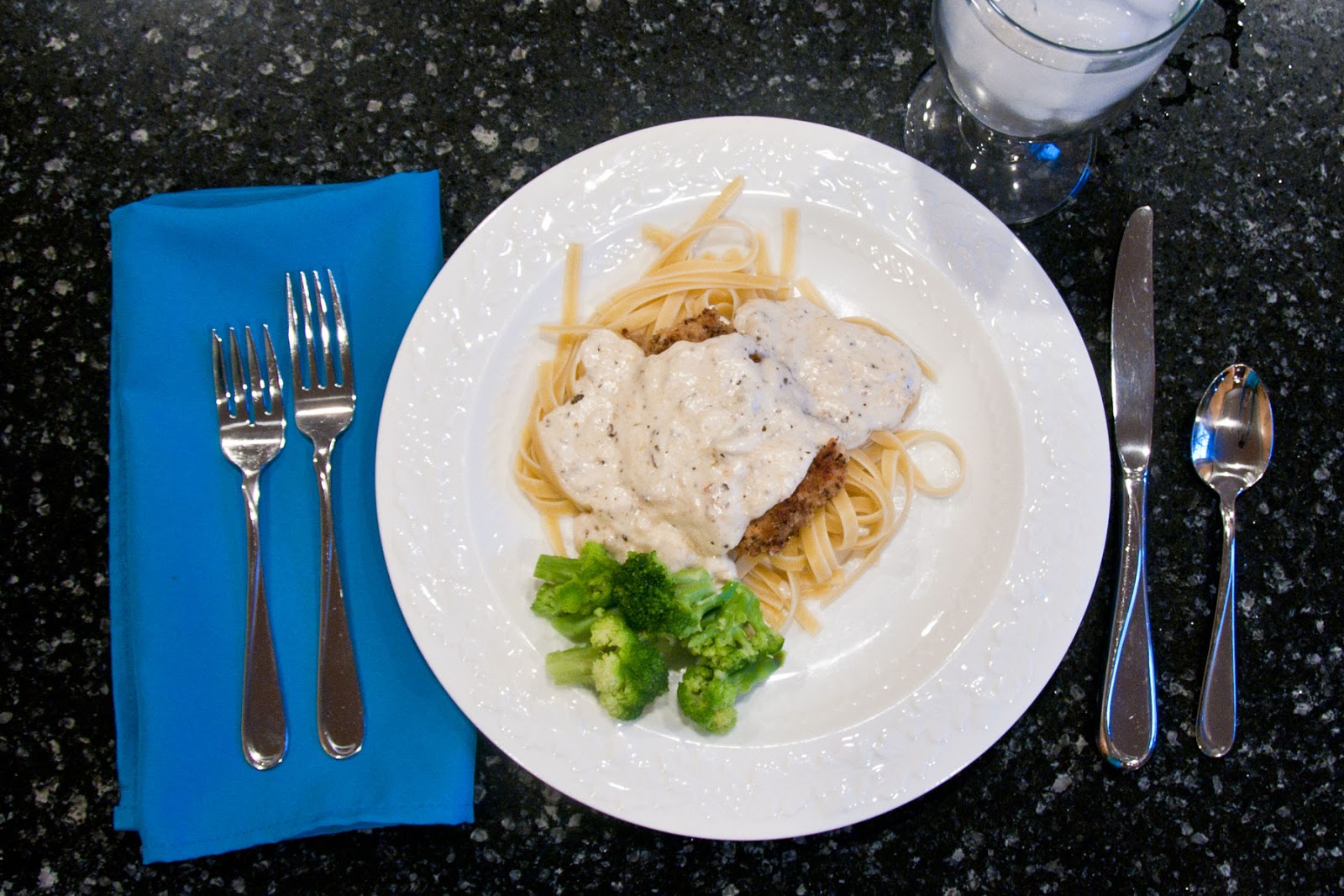 Sauce:  Deglaze the pan with the chicken broth.  Add the cream, basil, salt, and pepper.  Add 1 cup of grated Parmesan cheese and stir until melted.  Mix the corn starch and water together in a separate bowl.  Add a little at a time to the sauce and stir until desired thickness is reached.  Place chicken on your favorite pasta and then cover with sauce.