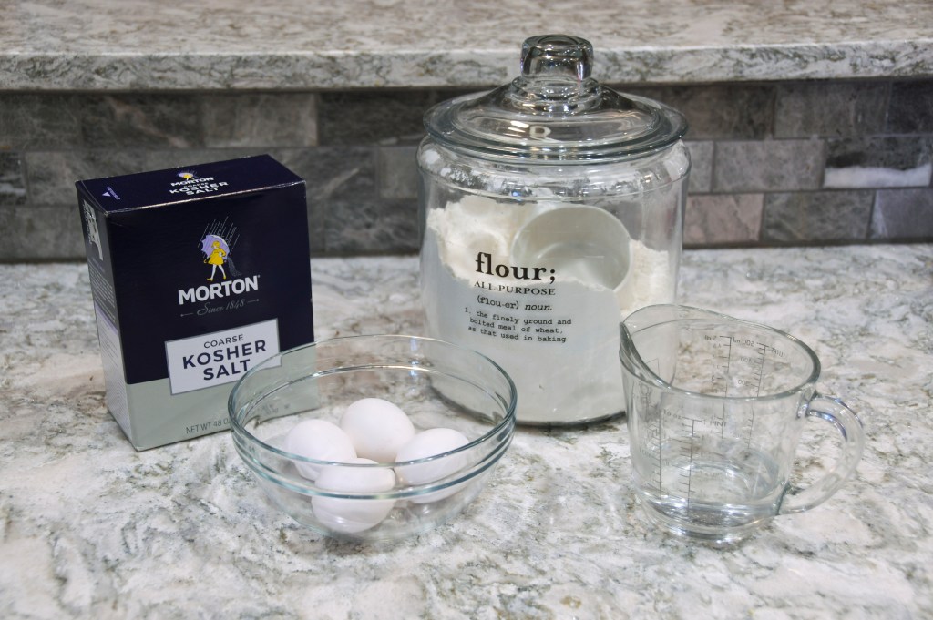 The ingredients for pasta are simple—flour, eggs, salt, and water.