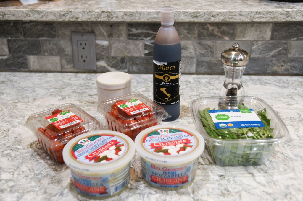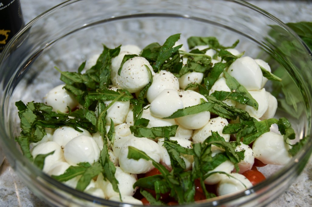 First you’ll need to drain your fresh mozzarella balls. I like to use Ciliegine sized mozzarella, but you could also use pearls. Rinse and drain your tomatoes. Grape tomatoes work well with this salad both because of their size and their sweet flavor.
