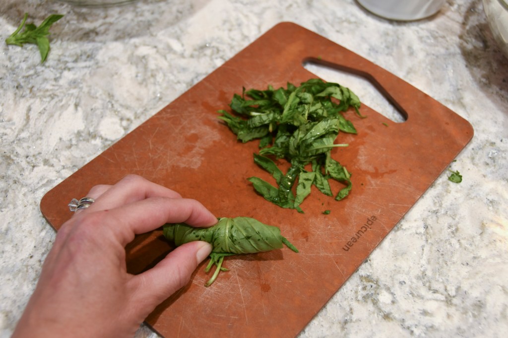 Next you’ll want to add a chiffonade of basil to the bowl. You slice the basil by stacking it, rolling it into a tight pinwheel, and then slicing it into thin strips. The sharper the knife and quicker your slice, the less bruised your basil will be. Clearly, my knife could use some sharpening.