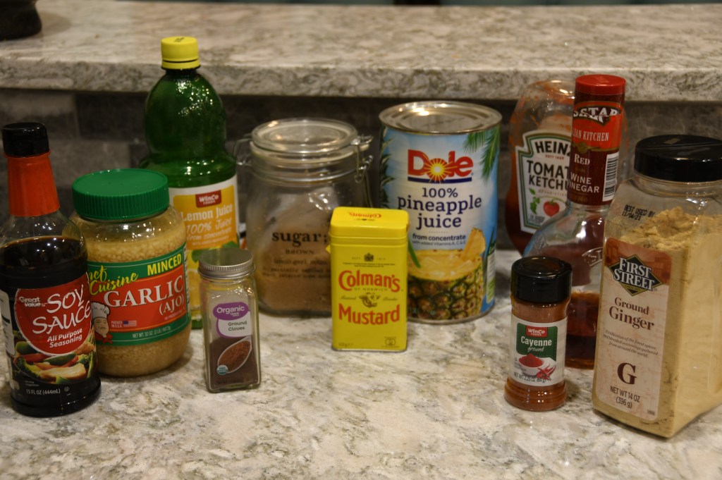 Mix pineapple juice, brown sugar, mustard powder, ketchup, red wine vinegar, lemon juice, soy sauce, cloves, ginger, garlic, and cayenne pepper. I like to do this in the cooking pot and then add the ribs. Cover. Cook on high for 4 hours or low for 6-8 hours.