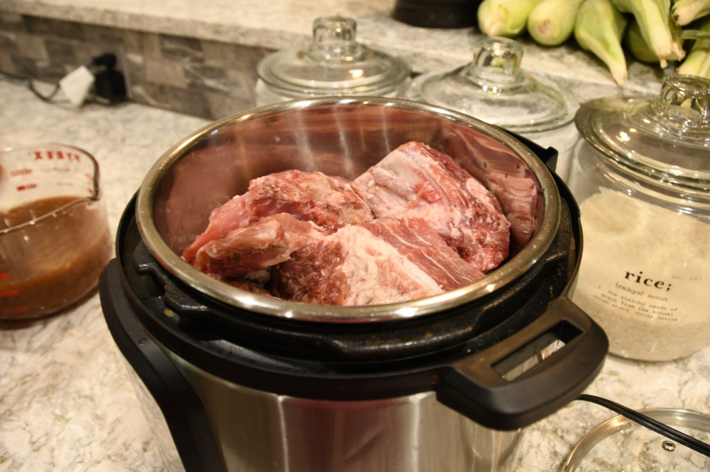 Mix together all of the ingredients from the recipe in the pot except the ribs and the barbecue sauce. Cut the ribs into serving size pieces. Add the ribs to the Instant Pot. ( You can also just mix the marinade in a bowl and then pour it over the top of the ribs.)